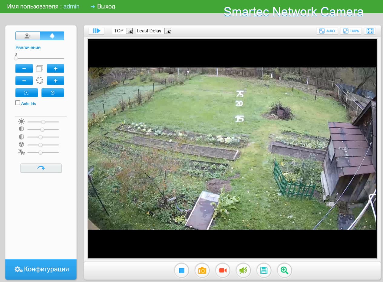 Главная страница содержит окно просмотра видеопотока и несколько инструментов для базовой настройки изображения: яркости, контраста, интенсивности цвета и других. Здесь же можно сделать стоп-кадр, активировать запись вручную, включить/отключить звук, приблизить выбранный регион. Выпадающий по нажатию правой кнопки мыши диалоговый список позволяет развернуть видеопоток во весь экран, изменить соотношение сторон, сделать стоп-кадр и активировать отображение технической информации о видеопотоке.