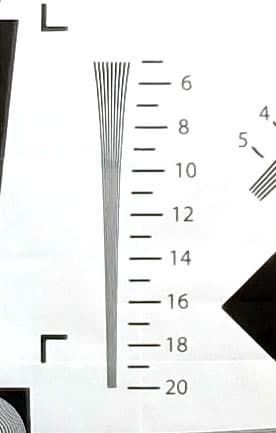Измерение разрешающей способности камеры с помощью стандартной тестовой таблицы оказалось затрудненным в силу некорректности результатов измерения. Дело в том, что довольно широкий угол обзора камеры приводит к получению картинки с заметным оптическим бочкообразным искажением типа «FishEye» — изображение оказывается «натянутым на сферу» и в центре кадра разрешающая способность камеры оказывается выше, чем по краям кадра. По указанной причине измерение разрешающей способности камер, имеющих широкий и сверхширокий угол обзора, измеряется путем съемки ключевого участка таблицы, распечатанного на большом листе. Съемка проводится в плавном движении с постепенным увеличением расстояния от камеры до мишени. Впоследствии полученный результат совмещается в видеоредакторе с оригинальным полупрозрачным снимком тестовой таблицы до совпадения пропорций ключевых элементов. При этом изменения размеров оригинального кадра не происходит. Результатом тестирования является участок тестовой таблицы с размерами, отвечающими оригинальному кадру и более точно отображающий реальную разрешающую способность тестируемой камеры.