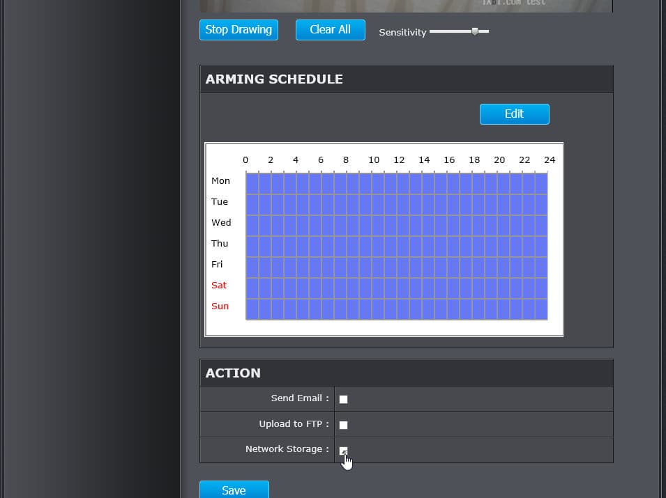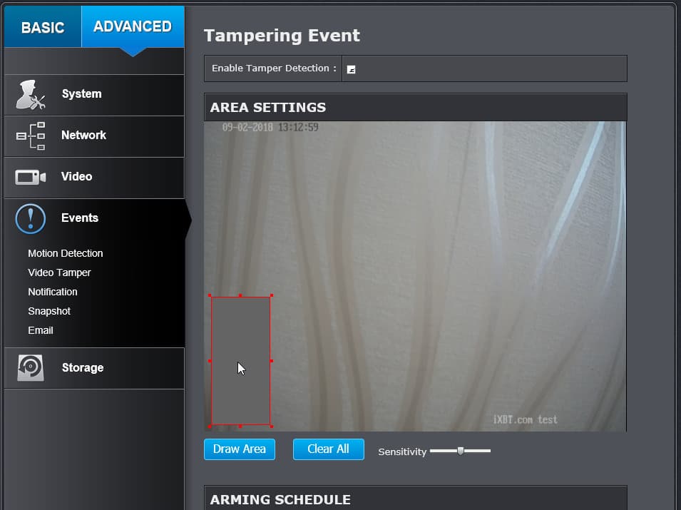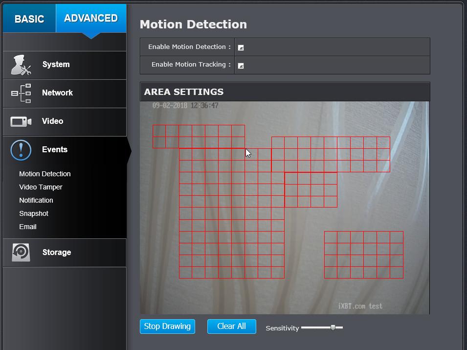 Настройки детектора движения позволяют вручную, мышкой, нарисовать зону любой конфигурации. Эта зона впоследствии будет анализироваться на предмет движения. Настройка чувствительности детектора содержит единственный ползунок без цифрового поля для точной подстройки значения.