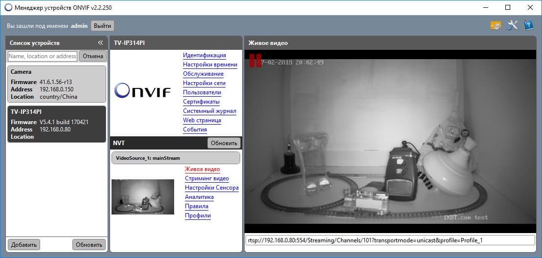 В нашем же случае при наличии единственной камеры никакая из перечисленных программ не понадобится. Для того, чтобы отыскать камеру в локальной сети, достаточно заглянуть в список подключенных устройств в настройках роутера, либо воспользоваться универсальной программой, например, ONVIF Device Manager. Благодаря тому, что рассматриваемый аппарат полностью поддерживает стандартизованные протоколы ONVIF, в этом приложении можно не только изменить различные параметры камеры, но и увидеть полную ссылку на ее RTSP-потоки.