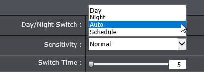 Изучим работу автоматики, которая переключает камеру из режима День в режим Ночь. Параметры, которые отвечают за пороговые значения освещенности, изменяются в соответствующей вкладке настроек изображения камеры. Здесь предусмотрено автоматическое и ручной переключение режимов, а также переключение по расписанию. Имеется выбор уровня чувствительности датчика освещенности и даже настройка временного интервала, чтобы камера не переключала режимы из-за кратковременного изменения освещенности.
