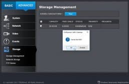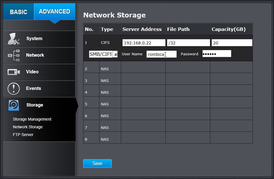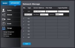 Наконец, последний раздел настроек — Storage. Находящиеся здесь инструменты позволяют выбрать и настроить сетевое хранилище для записи архива. Это хранилище должно располагаться на сетевом накопителе и представлять собой отдельный жесткий диск либо USB-диск. Камера поддерживает два протокола доступа к сетевым накопителям: NFS и SAMBA.