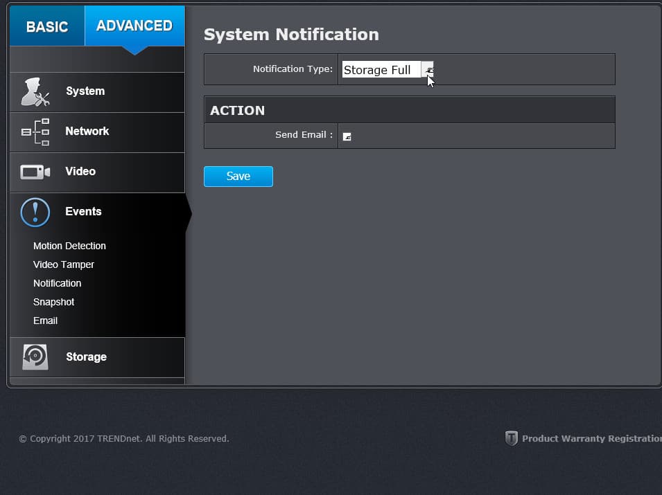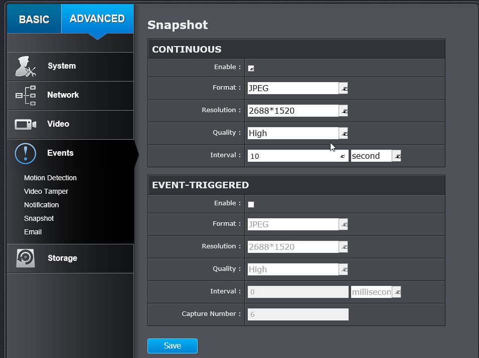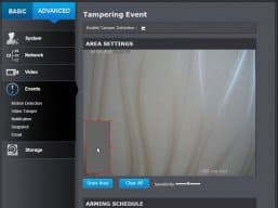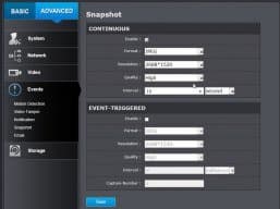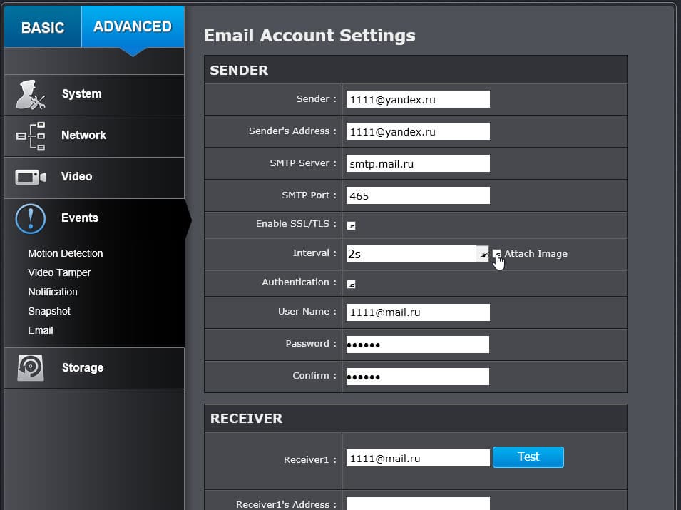 Раздел Events отвечает за работу детектора движения и определяет реакцию камеры на фиксируемые события.