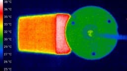 Исправная работа камеры гарантируется в температурном диапазоне от −30 до +60 °C при относительной влажности до 95%. На следующих теплоснимках показана рассматриваемая камера после многочасовой беспрерывной работы в комнатных условиях при температуре около +25 °C. Можно видеть, что риск перегрева камеры отсутствует: внутреннее тепло распределяется по металлическому корпусу, который играет роль достаточно эффективного радиатора.