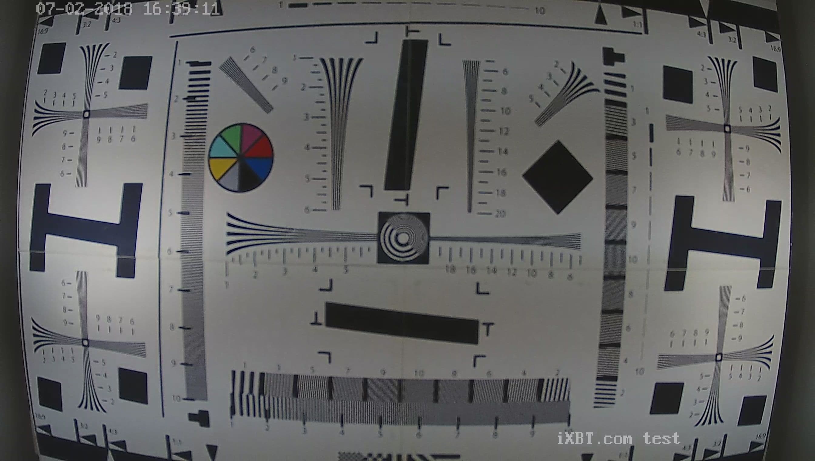 Объектив камеры дает довольно заметное оптическое искажение типа «рыбий глаз», поэтому съемка обычной тестовой таблицы становится невозможной. Такой съемке мешает также отсутствие фокуса,поскольку таблицу приходится придвигать к камере ближе минимального расстояния фокусировки.