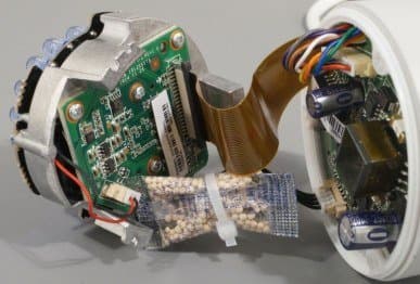 Между двумя половинками блока камеры проложена силиконовая прокладка-кольцо, не допускающая попадания влаги внутрь конструкции. Электронная начинка аппарата состоит из двух частей: блока камеры и блока питания и связи. Эти платы соединены кабелем для питания камеры и диодов подсветки, а также многожильным шлейфом, по которому передаются данные.