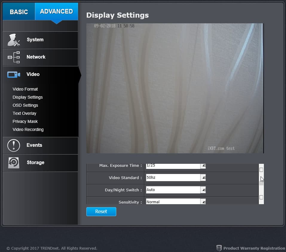 Таким образом, при настройке камеры следует внимательно выбирать выдержку для оптимального соотношения яркости картинки с уровнем усиления для получения детализированного кадра. По умолчанию в настройках установлена выдержка 1/25 с для системы PAL и 1/30 с для системы NTSC, однако ввиду того, что камера обладает датчиком с неплохой чувствительностью, это умолчание вполне можно сократить в два раза, ограничив максимальное время экспозиции кадра значениями 1/50 или 1/60 с. В итоге мы получим достаточно высокую детализацию видео при любой освещенности, а смаз объектов сведется к минимуму.