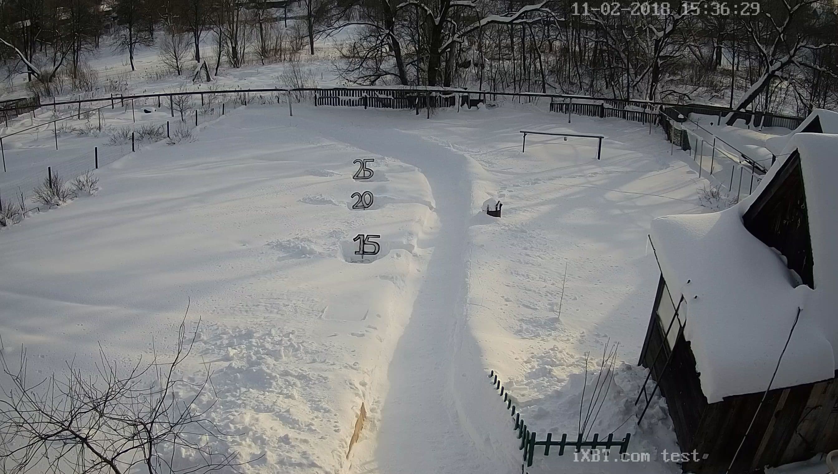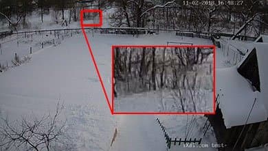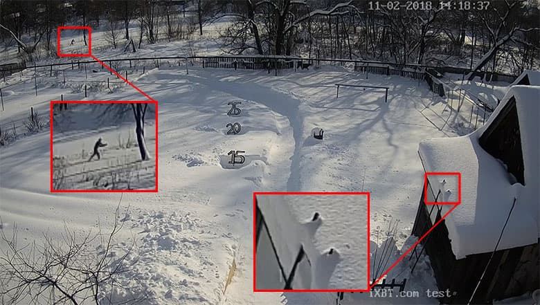 На следующем стоп-кадре можно видеть, что объект, расположенный в пяти метрах от камеры, и одинокий лыжник, идущий в 100 метрах от камеры, имеют одинаково четкие контуры, это чрезвычайно важно для стационарного видеонаблюдения.