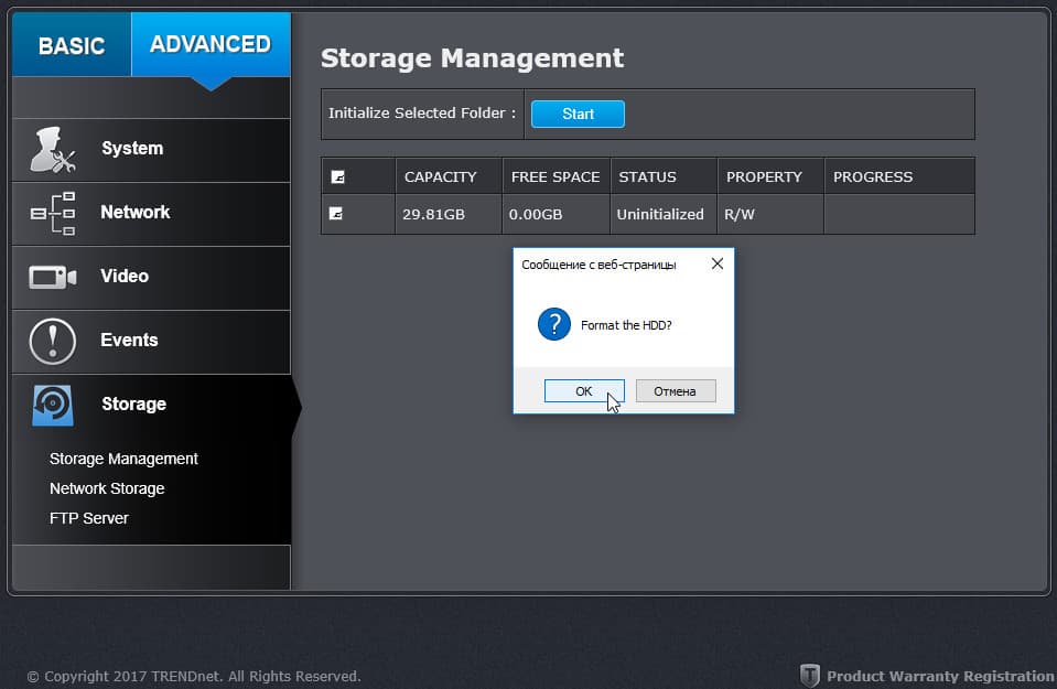 Во время форматирования подключенного сетевого хранилища пользователь может столкнуться с одним затруднением: это форматирование может длиться очень долго. Оказывается, вместе с форматированием камера создает на выделенном ей диске (мы использовали обычную флэшку, подключенную к сетевому медиаплееру) специфическую файловую структуру наподобие той, которая используется в стационарных видеорегистраторах. Особенность такой структуры заключается в том, что дисковое пространство, которое запланировано к использованию, предварительно «забивается» множеством одинаковых файлов-сегментов с нулевыми данными, но имеющими определенный одинаковый объем.