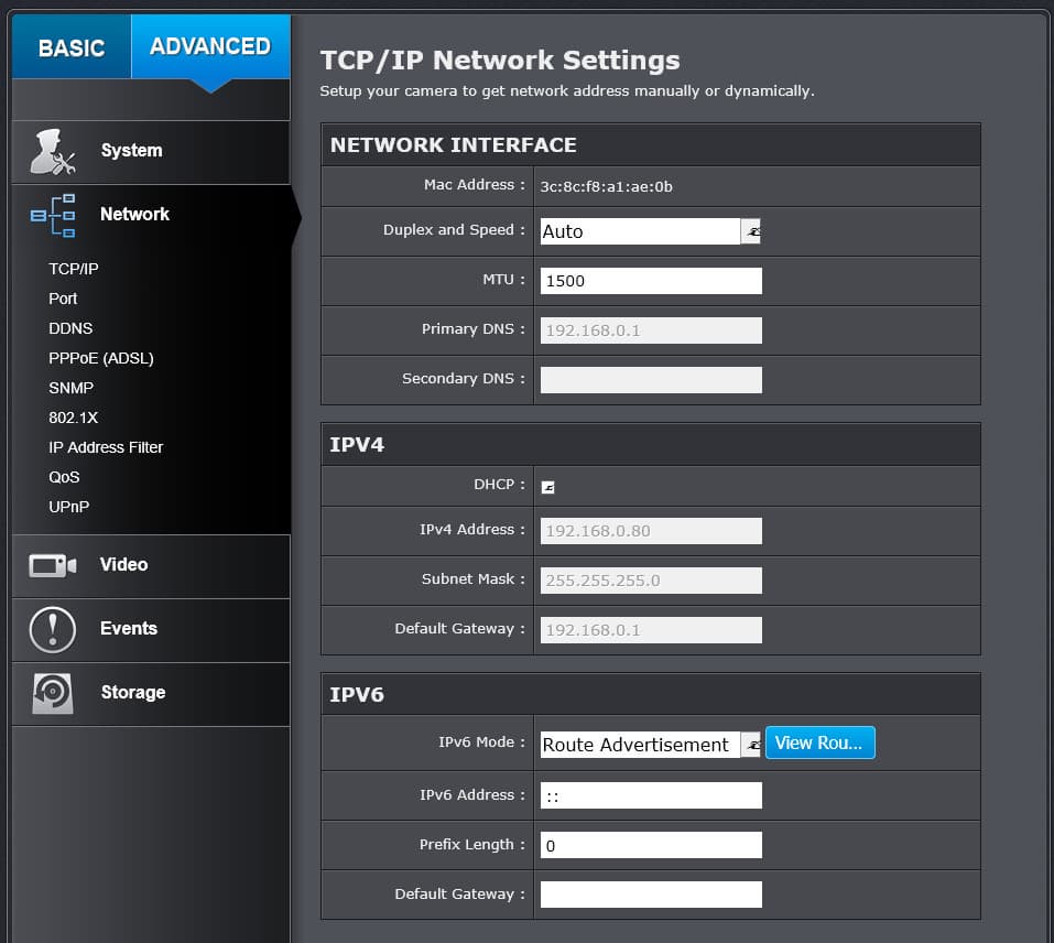 Следующий раздел настроек — Network — управляет сетевыми соединениями и поддержкой протоколов. Здесь находятся стандартные инструменты, необходимые для выбора способа присвоения IP адреса, изменения стандартных портов, активации службы сопоставления доменного имени с динамическим IP-адресом (DDNS), настройки прямого подключения к интернету (PPPoE) и прочие параметры.
