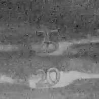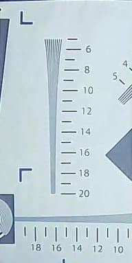 По указанным причинам мы воспользовались вторым способом получения наглядного значения разрешающей способности. Он производится путем съемки одного ключевого участка таблицы, распечатанного на большом листе. Съемка проводится в плавном движении с постепенным увеличением расстояния от камеры до мишени. Впоследствии полученный результат совмещается в видеоредакторе с оригинальным полупрозрачным снимком тестовой таблицы до совпадения пропорций ключевых элементов. При этом изменение размеров оригинального кадра не происходит. Результатом тестирования является участок тестовой таблицы с размерами, отвечающими оригинальному кадру и наиболее точно отображающий реальную разрешающую способность тестируемой камеры.