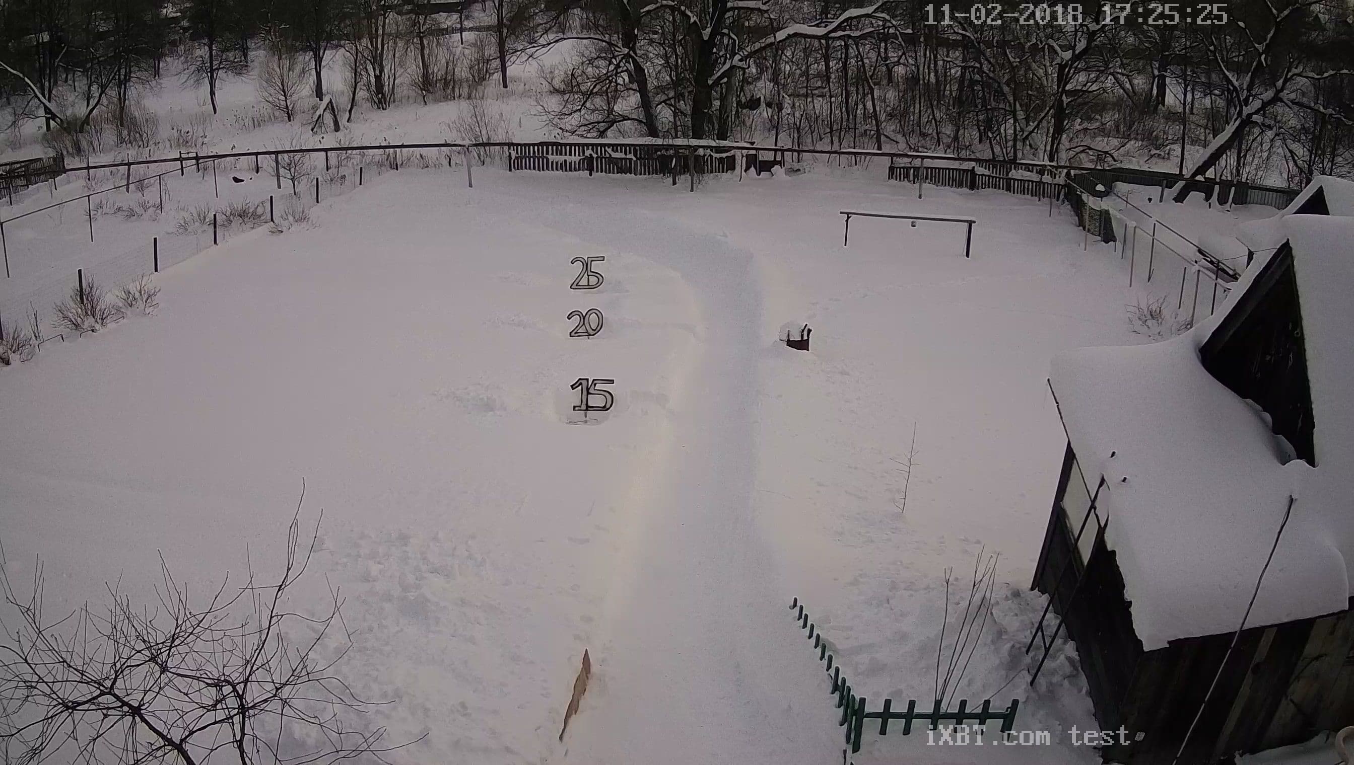 Инфракрасную подсветку камеры можно оценить как очень эффективную. Указанные в спецификациях 30 метров вполне соответствуют действительности, однако, если съемка будет вестись в полной темноте (что в реальности бывает крайне редко), то эффективность подсветки окажется еще выше. Приведем стоп-кадры, полученные из видео, снятого в разных режимах работы. Крупные пластиковые цифры, расположенные в центре кадра, обозначают расстояние от камеры до цифр в метрах. А чтобы разница в яркости кадра в разных режимах была очевидно, немного поможем камере, иногда включая небольшой галогеновый прожектор мощностью 100 Ватт.
