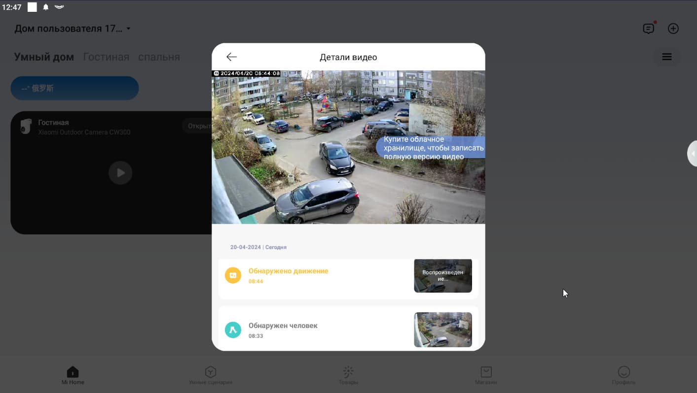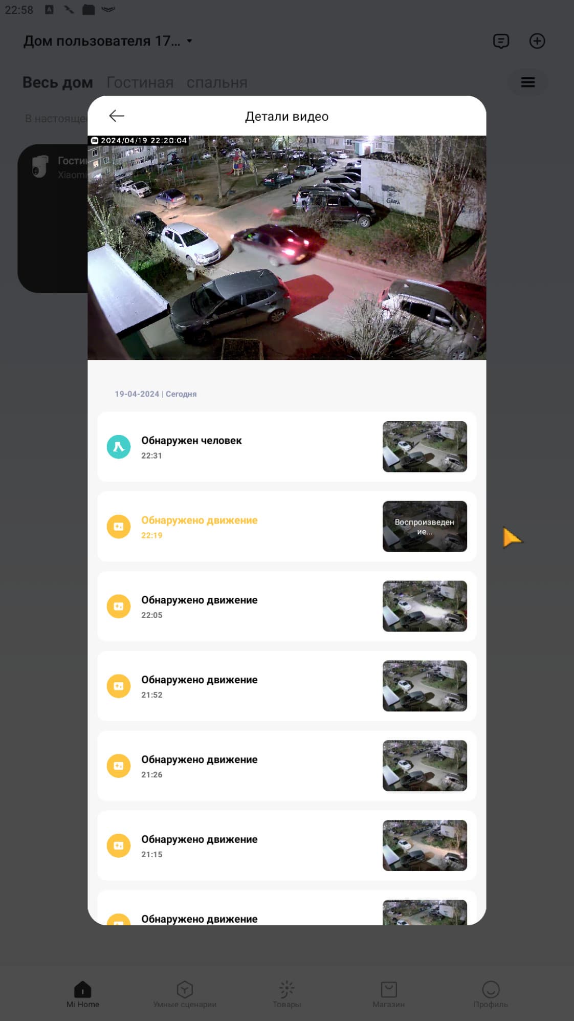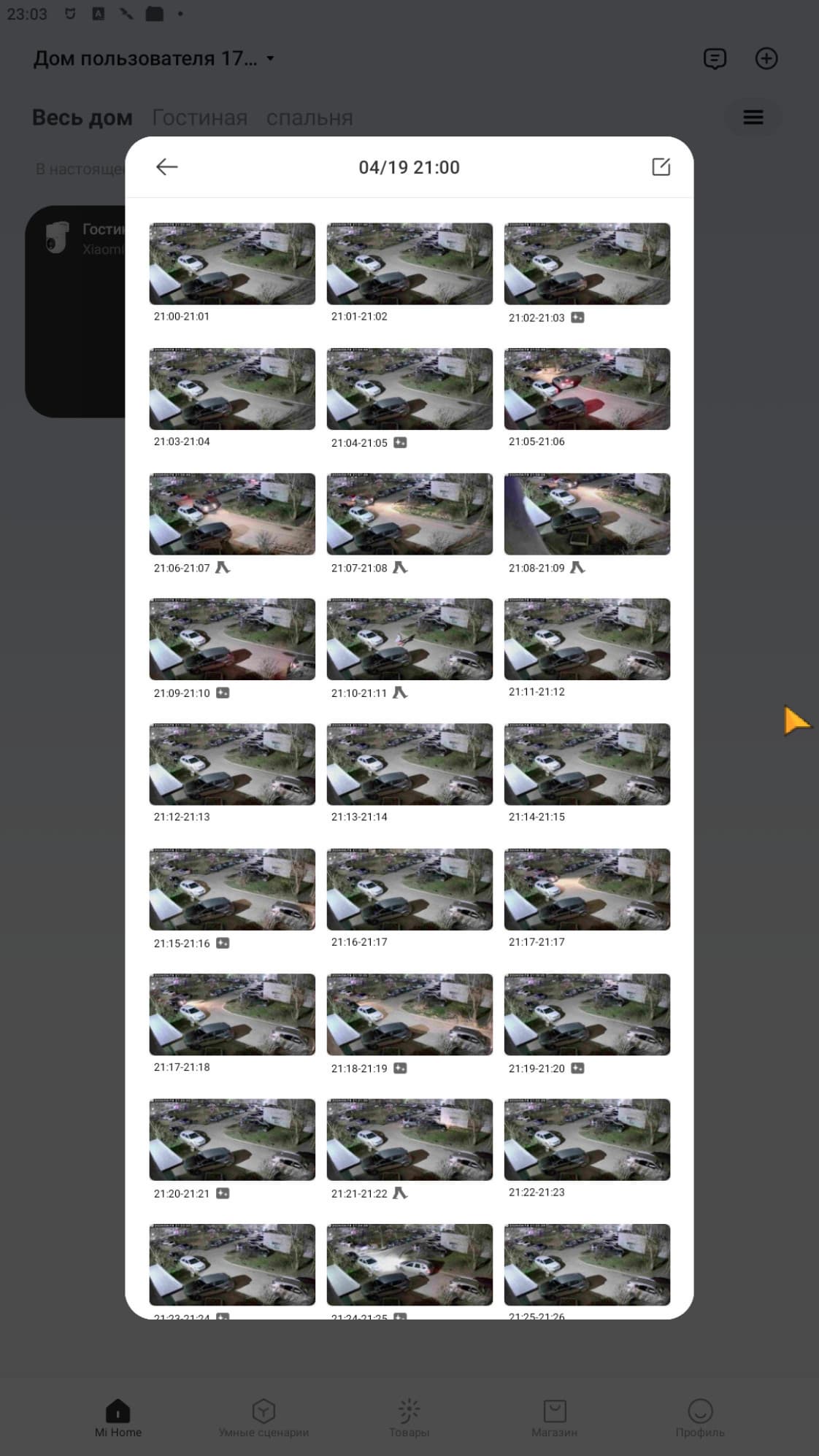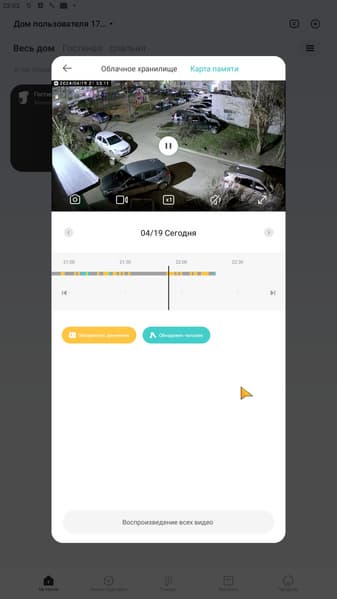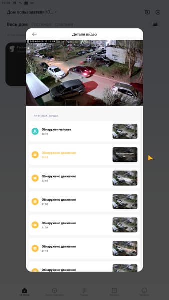 Если на страничке камеры в приложении Mi Home поднять нижнюю часть шторки вверх, вы увидите три пункта, отвечающие за просмотр архива, его организацию и управление им. Нас в данном случае интересует пункт первый, Домашнее наблюдение. Именно здесь каждая тревожная запись, сделанная камерой, помечается особым образом. Камера умеет отличать обычное движение (листва, тень, блик, автомобиль и т. д.) от движущейся фигуры человека, маркируя ролики соответствующим образом.