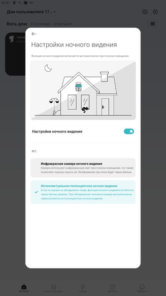 В отдельный пункт настроек вынесена работа встроенной в камеру подсветки. Напомним, она состоит из диодов двух типов: обычных белых и инфракрасных. Тут мы снова видим странную логику авторов прошивки камер Xiaomi: ИК-подсветка не включится, если камера считает, что ей достаточно света для продолжения цветной съемки. Так же странно работает и белая подсветка-прожектор: она включается либо принудительно по нажатию специальной иконки, либо при обнаружении человеческой фигуры.