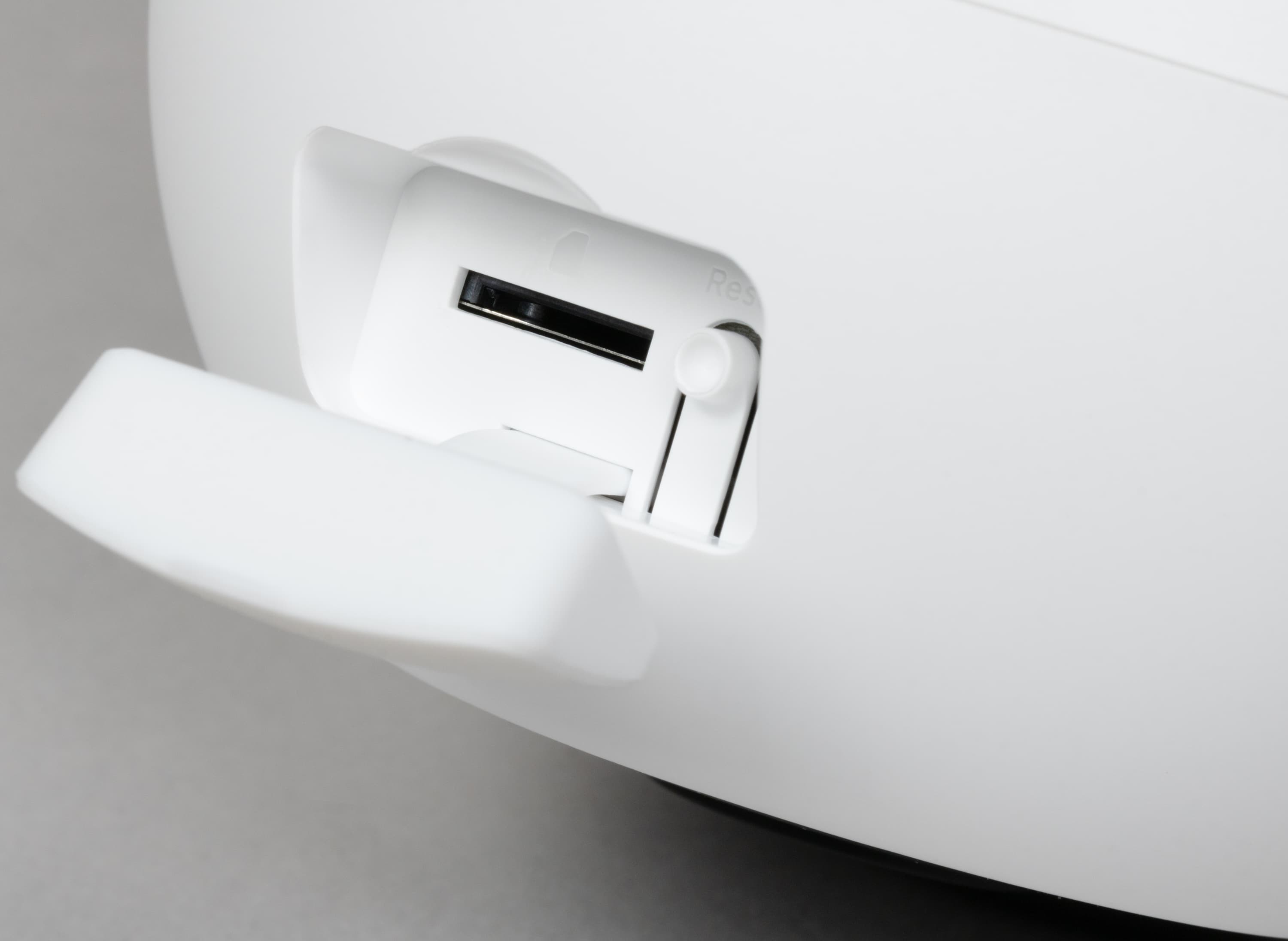Слот для карты памяти и кнопка сброса камеры к заводским настройкам спрятаны под крышкой, которая находится ниже объектива. Чтобы к ней подобраться, нужно рукой изменить угол наклона камеры — повернуть «шарик» вверх. Не бойтесь, ничего не сломаете. Механизм наклона и поворота в таких камерах выполнен не по схеме жестких зубчатых сцеплений — тут используется обычное трение, когда ведущий ролик бегает по силиконовой направляющей.