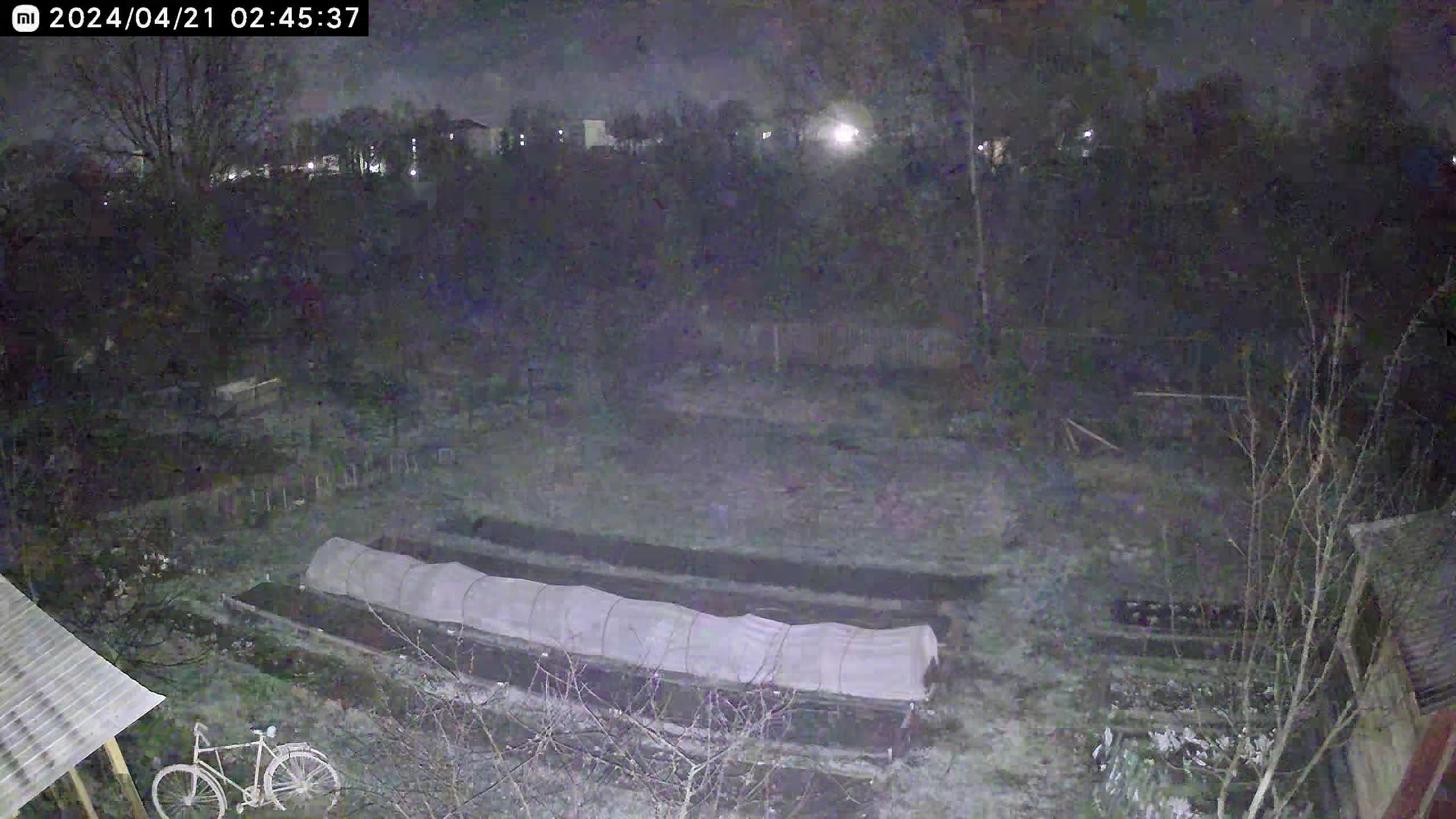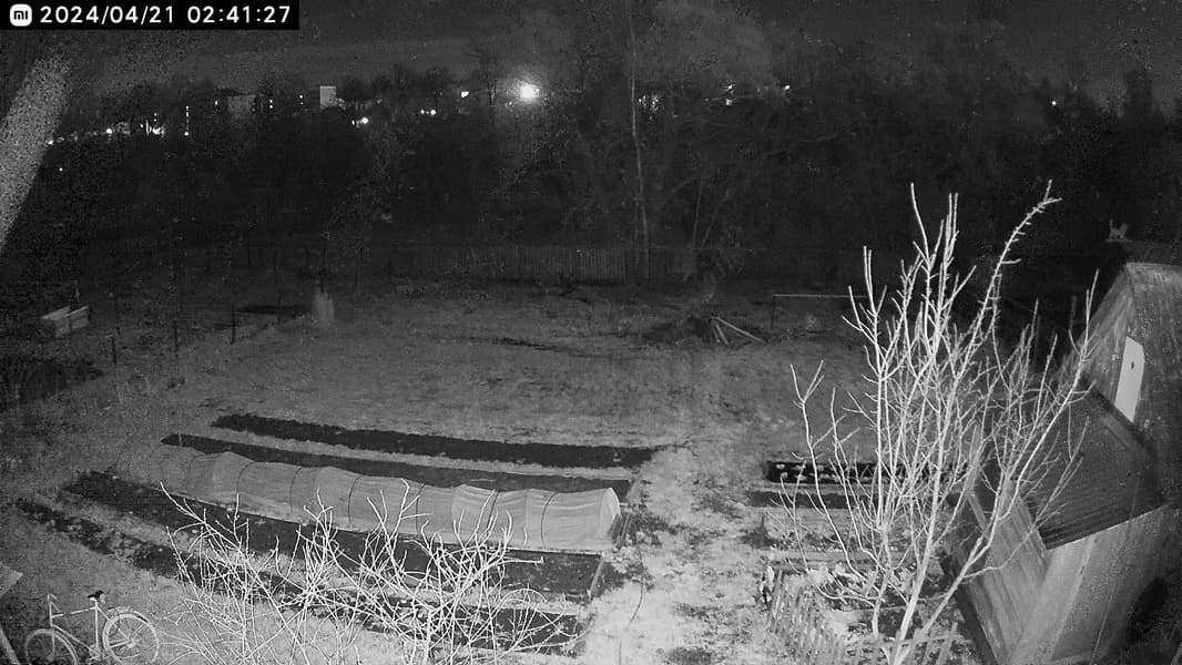 В отличие от городской черты, за городом нет подъездов и приподъездного освещения. Здесь камера согласилась перейти в ночной режим с инфракрасной подсветкой. А вот режим цветной ночной съемки с белым прожектором нам не понравился — пылинки и ворсинки, которых в воздухе всегда с избытком, подсвечиваются прожектором и превращают картинку в ярмарку цветного шума. Опять сказывается недостаток битрейта.