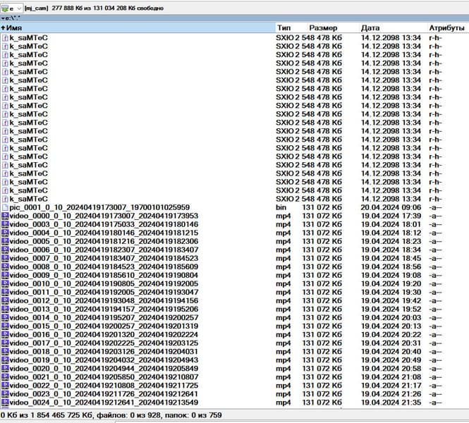 Предупредим: не нужно извлекать карту памяти для копирования с нее каких-то материалов. Ничего не получится — здесь нет файлов, пригодных к просмотру. Камера использует другой ведения архива. Такой, который используется в стационарных системах видеонаблюдения. Он заключается в следующем: при форматировании карты посредством софта камеры (а без такой операции работа камеры с картой невозможна) в хранилище создается огромное количество папок и файлов, в том числе индексных. В итоге карта под завязку забивается файлами с нулевым содержимым, свободного места не остается.