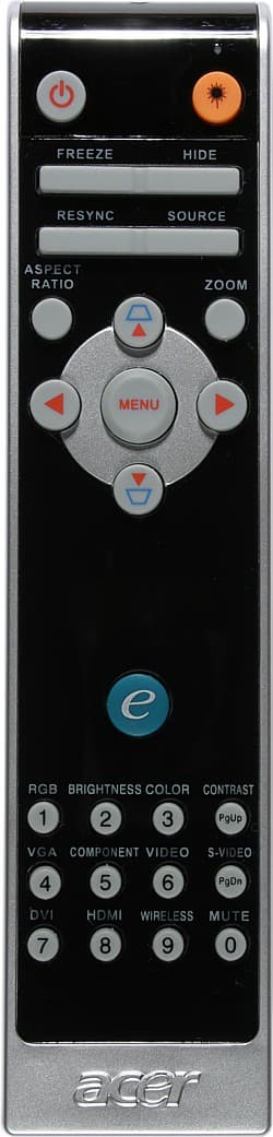 Пульт согласуется с внешним видом проектора. Сверху гладко-черный, снизу — матово-черный, а по его периметру серебристая рамка. Кнопки непривычно высокие и громко щелкают при нажатии. В целом пульт не отличается высокой эргономичностью, так как немного неудобно ложится в руку, кнопки слишком разнесены, а ориентироваться в них сложно из-за неконтрастных и мелких обозначений. Если подключить проектор по USB к компьютеру, то кнопками пульта PgUp и PgDn (справа от цифровых) в ущерб их обычных функций можно дистанционно перелистывать слайды презентации. Большая голубая кнопка с буквой e выводит на экран одно из трех меню быстрого доступа: выбор режима, установка таймера или переключение заставок.