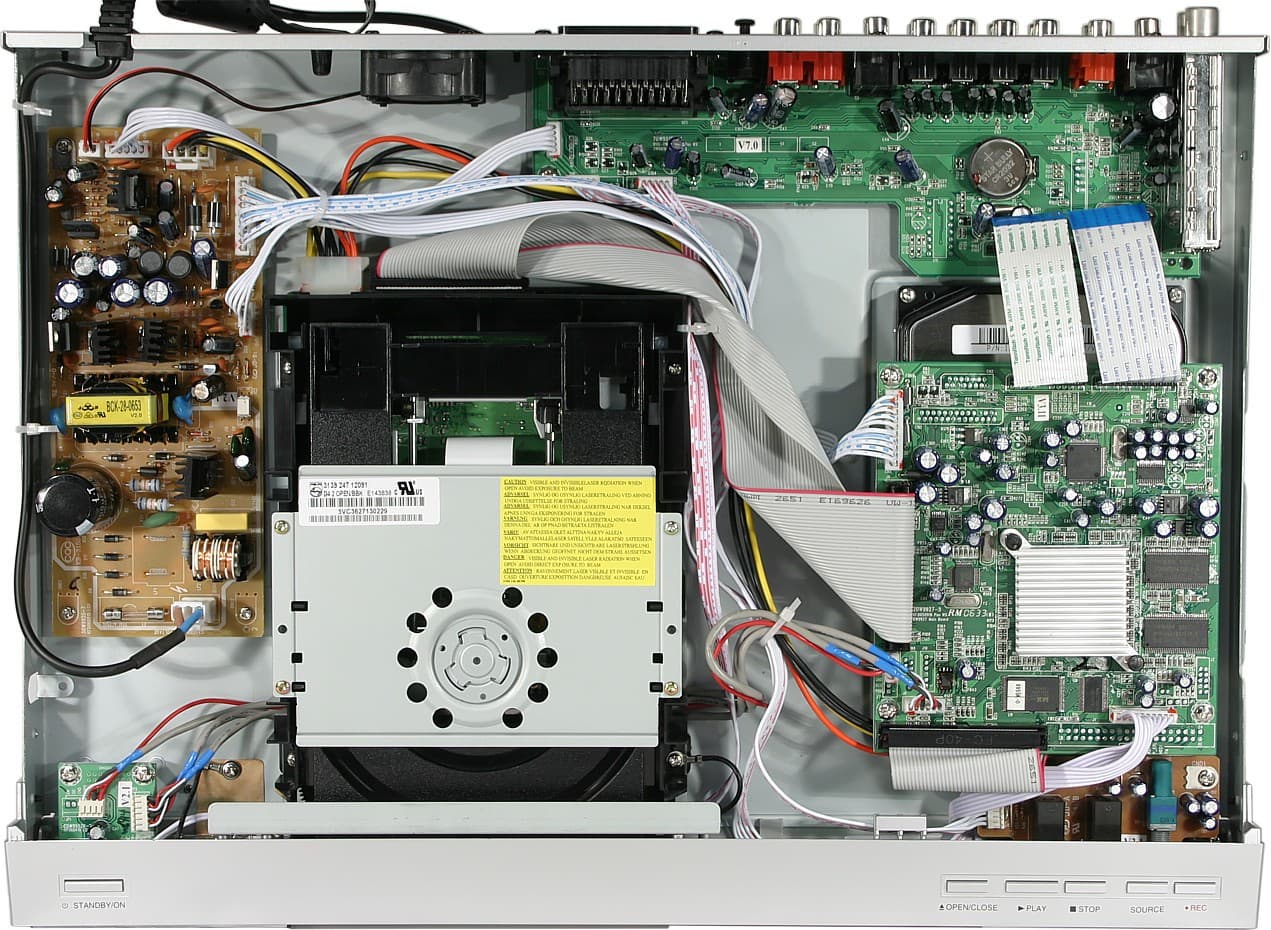 Традиционное вскрытие неожиданностей не принесло. Рекордер, видимо, основан на мультимедийном процессоре DiMeNsion-8652 от LSI Logic. За оцифровку видеосигнала отвечает микросхема L2146 тоже от LSI Logic. ВидеоЦАПы встроены в DMN-8652. В рекордере используется 6-ти-канальный аудиоЦАП CS4360 (192 кГц, 24 бит, динамический диапазон 102 дБ, THD+N = -91 дБ). Оцифровкой стереосигнала занимается аудиоАЦП CS5340 (THD+N = -94 дБ).