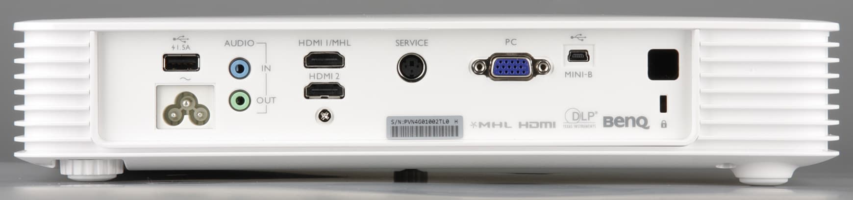 Один из трех разъемов HDMI поддерживает подключение к мобильным устройствам по MHL, но пользователю еще придется где-то найти соответствующий кабель-переходник с разъема HDMI на Micro-USB и планшет или смартфон, которые этот MHL поддерживают. Звуковые входы и выходы — это пара гнезд миниджек 3,5 мм. Есть два сервисных разъема (обновление микропрограммы и т. д.). Порт USB типа A предназначен только для подачи питания на внешние устройства, например, на беспроводные адаптеры или на планшеты и смартфоны. Крышка на днище скрывает нишу с третьим разъемом HDMI, а также вилку Micro-USB на коротком кабеле. Подразумевается, что там будет находится адаптер BenQ QCast (QP01), хотя никто не запрещает использовать что-то аналогичное, подключаемое к HDMI, лишь бы поместилось. Мы подключили именно QCast, так как его нам доставили вместе с проектором.