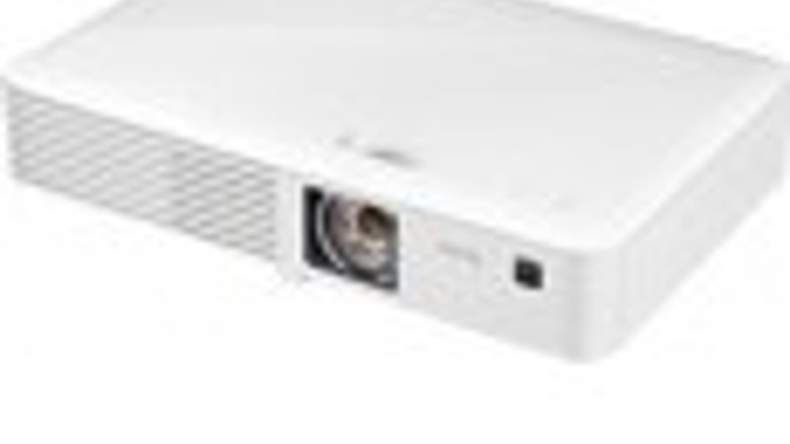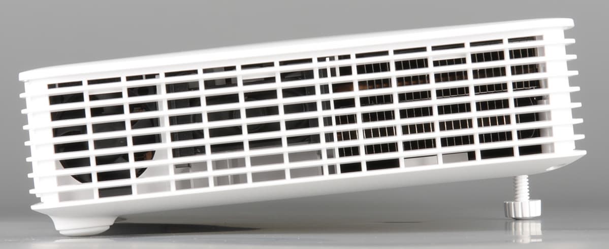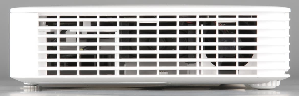 Проектор относительно тяжелый (наши данные — 2,4 кг), так как оснащен встроенным блоком питания. Однако такой вариант гораздо удобнее внешнего адаптера питания, который все время мешается и который можно случайно потерять или забыть взять с собой на презентацию. Корпус проектора изготовлен из белого пластика с зеркально-гладкой поверхностью на верхней панели и с матовой в остальных местах. По бокам, спереди и даже на днище есть вентиляционные решетки. За боковыми решетками примерно по центру можно разглядеть по громкоговорителю вытянутой формы.
