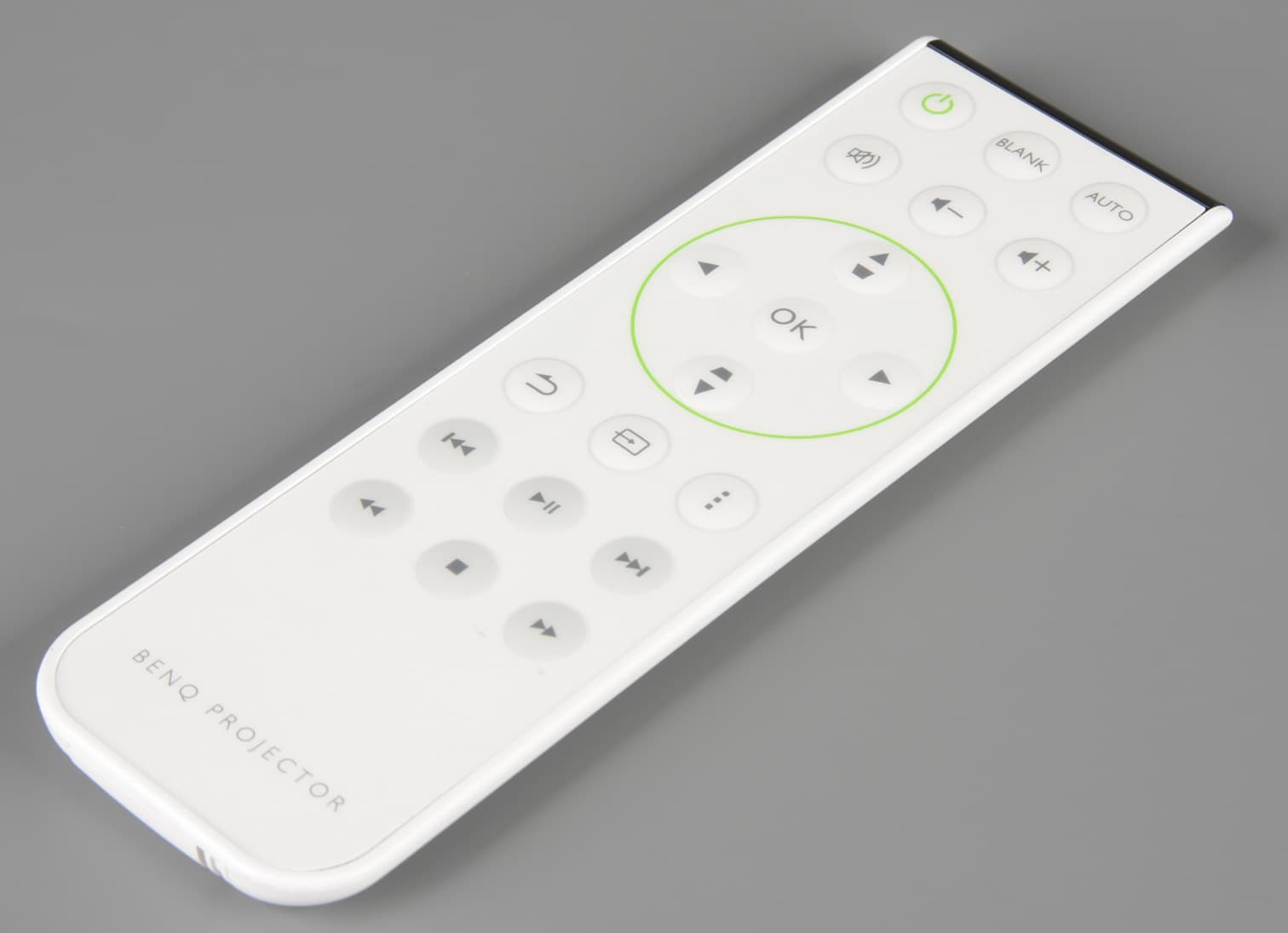 Пульт небольшой, легкий (39 г) и почти плоский, такое сочетание соответствует этому мобильному проектору. Обозначения на кнопках читаемые, но сами кнопки мембранные и едва выступают на плоскостью корпуса, поэтому на ощупь находятся с трудом. В целом хорошей эргономикой пульт не отличается. Работает пульт от одной «таблетки» CR2025.