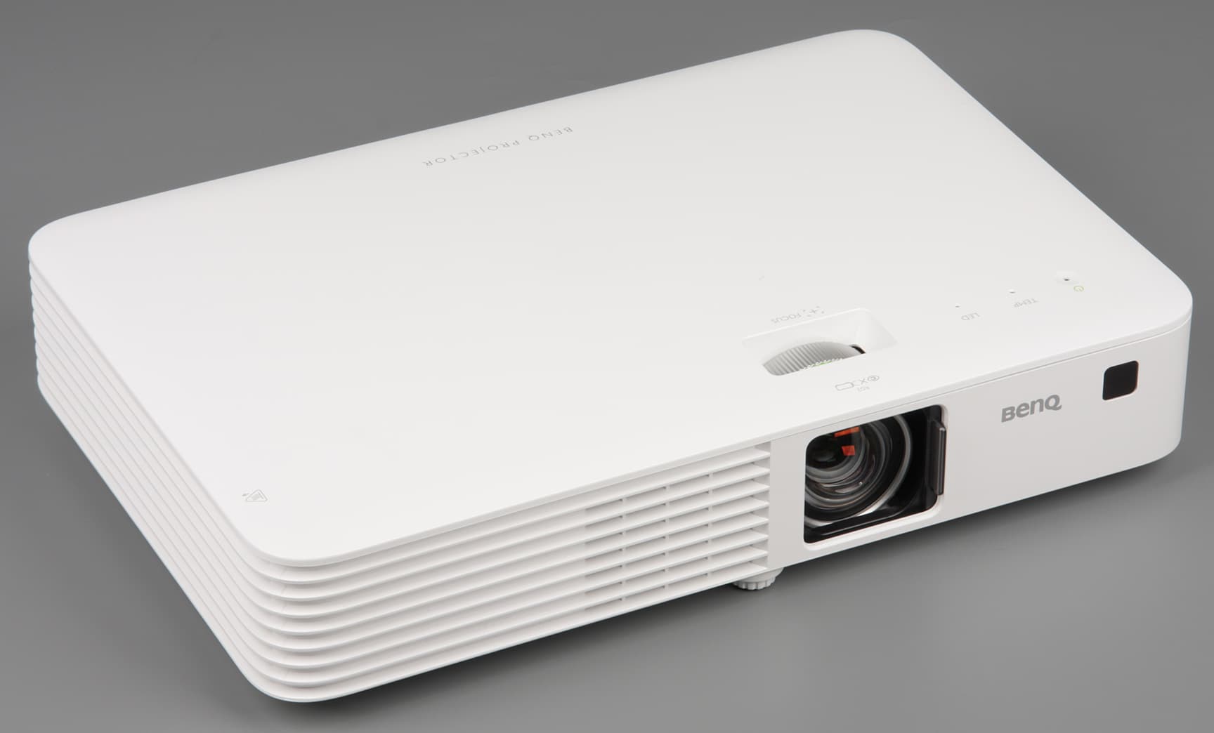 Левая задняя ножка тоже вывинчивается (на 11 мм), что позволяет устранить небольшой перекос проектора, при его установке на горизонтальную поверхность. К ножкам приклеены выпуклые резиновые противоскользящие подошвы. На передней панели есть окошко второго ИК-приемника. Объектив утоплен в корпус, от пыли и пальцев его в нерабочем состоянии защищает сдвигающаяся вручную шторка из тонированного и матированного пластика.