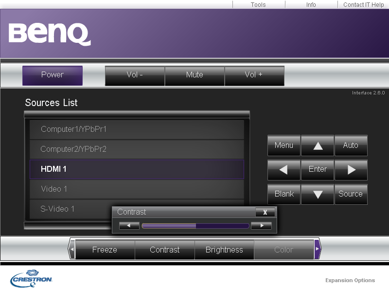 Разъемы доступны, но подписи к ним абсолютно нечитаемые. VGA-входы совместимы и с компонентными цветоразностными видеосигналами (потребуется соответствующий переходник на 3 RCA). Аудиовходов — два гнездо 3,5 мм миниджек и пара RCA. Звук на внешнюю аудиосистему выводится через второе гнездо 3,5 мм миниджек. Для передачи видеосигналов с первого VGA-входа на внешний монитор предназначен VGA-разъем серого цвета. Несколько нестандартным решением выглядит использование коаксиального (с центральным штырьком) разъема для подключения экрана с электромеханическим приводом. Питание на проектор подается через стандартный трехштырьковый разъем. Меню выбора источников изображения выводится при нажатии на кнопки SOURCE на корпусе и на пульте.
