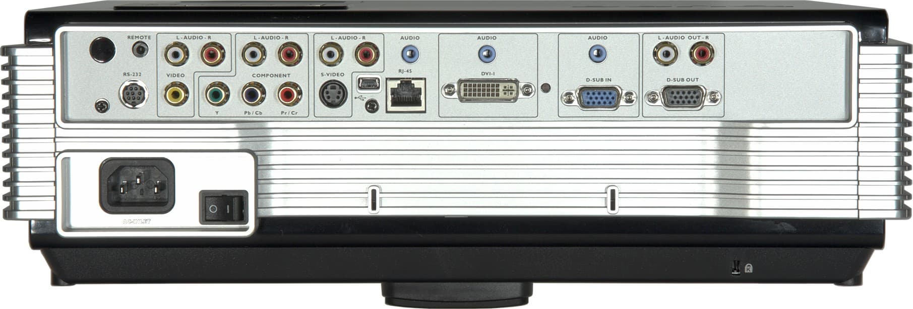 Интерфейсных разъемов много — пять типов видеовходов, каждый из которых спарен со своим аудиовходом (3,5 мм стереоминиджек или пара красно-белых RCA). О том, что производитель предполагает работу с бытовыми источниками видеосигнала, свидетельствует наличие обособленного компонентного входа (стандартные три RCA) и поддержка HDCP, наличие которой позволяет подключать проектор к видеотехнике с HDMI-выходом, например, к DVD- или BD-плееру с помощью простого пассивного переходника с HDMI на DVI. Вход DVI универсальный — принимает как аналоговые (RGB), так и цифровые видеосигналы (RGB и цветоразностные).