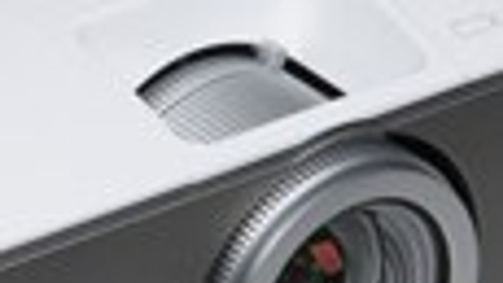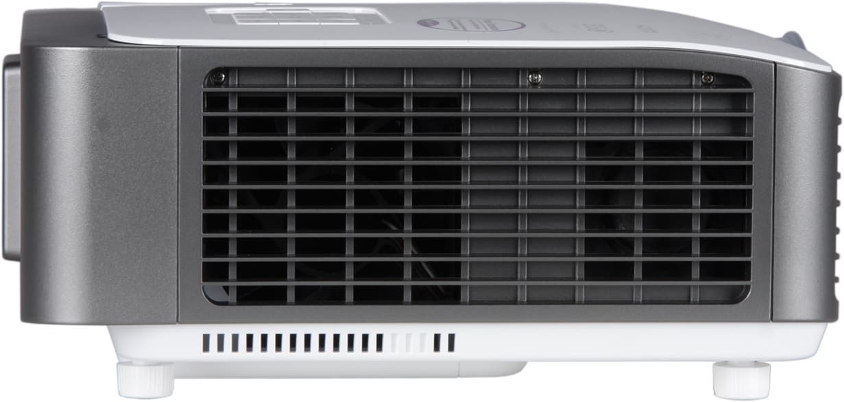 На дно этих ниш наклеен лист прочного прозрачного пластика — металлические края разъемов видимых царапин на нем не оставляют. Подписи к разъемам мелковаты и в основном не очень контрастные. Также на задней панели уже фактически на днище можно обнаружить разъем для кенсингтонского замка и более надежный стальной штифт для крепления «противоугонного» тросика. Правый и левый бока — сплошные решетки вентиляции, за ними можно разглядеть вентиляторы и относительно большие громкоговорители, расположенные ближе к передней части проектора.