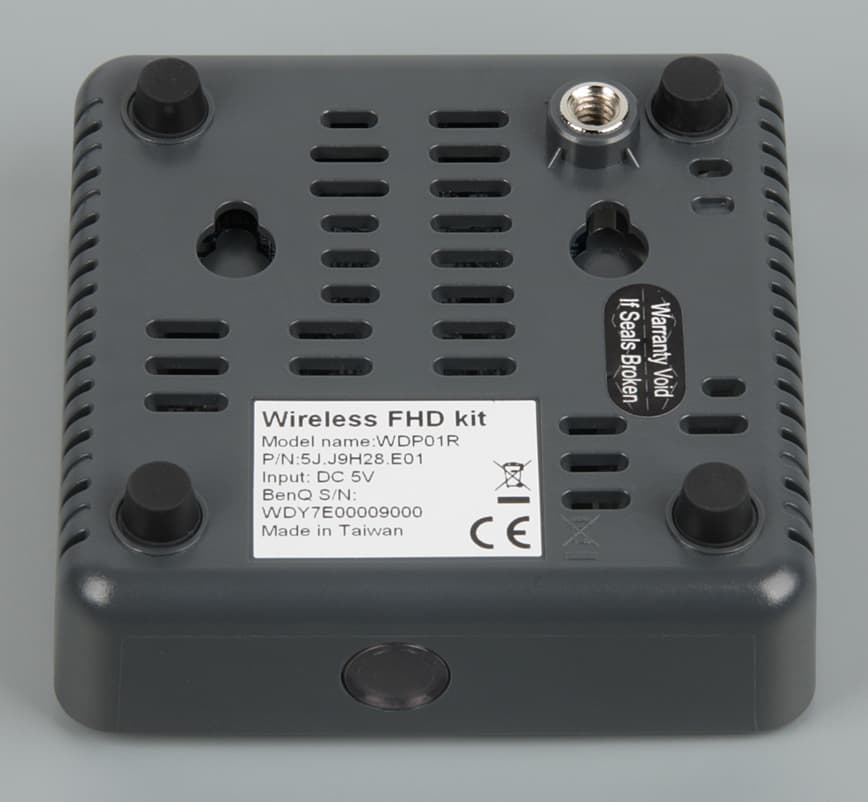 При работе внутренности коробочек нагреваются, поэтому для их охлаждения окружающим воздухом предусмотрены вентиляционные решетки, в том числе и на днище. Передатчик предлагается или просто ставить рядом с источником сигнала (на днище есть резиновые ножки), или вешать (две проушины), или закрепить на чем-нибудь со штативным винтом (соответствующее гнездо имеется). Конструкция приемника предполагает те же виды крепления, плюс два дополнительны варианта с использованием комплектных площадок. Обе площадки — плоская и угловая — прикручиваются к корпусу приемника идущим в комплекте штативным винтом. Затем, пропустив стяжку с «липучкой» через плоскую площадку, приемник можно примотать, например, к стойке потолочного крепления проектора. Угловая площадка предусматривает крепление к ряду совместимых проекторов BenQ — на сайте производителя указаны модели W1070+, W1080ST+ или W1350. Мы, как и указано выше, использовали проектор BenQ W1070+. На днище проектора есть фиксатор и резьбовое гнездо в металлической втулке (помечены красными кружками на фотографии ниже), к которым и крепится угловая площадка с помощью комплектного винта М3.