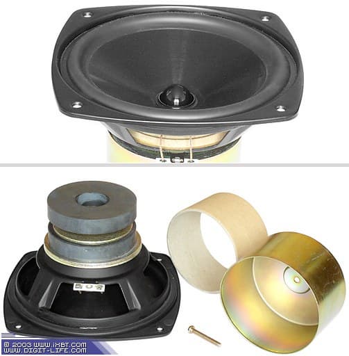 Конструкция НЧ/СЧ динамика несколько иная, нежели в других АС сегодняшнего теста. Помимо того, что диффузор заметно меньше (115 мм), так ещё и изготовлен он из другого полимера, напоминающего по фактуре скорее плотную глянцевую бумагу.