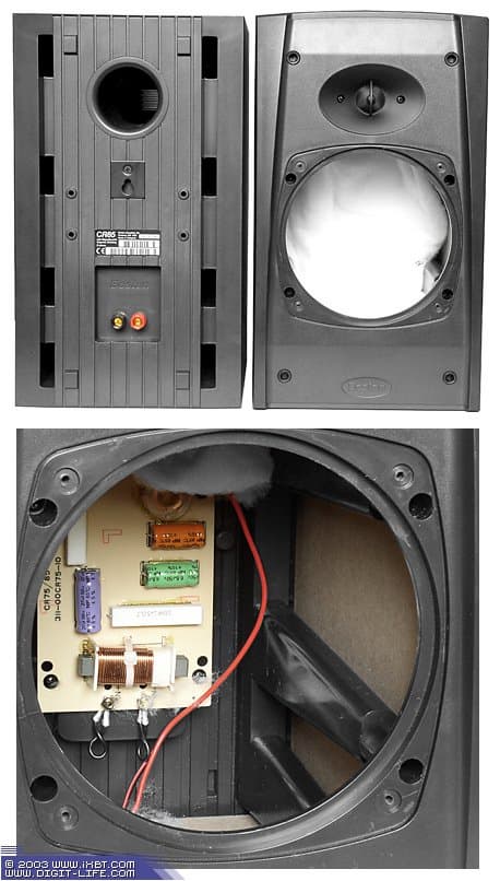 Двухполосная АС полочного типа с тыловым расположением порта фазоинвертора. Визуально CR-85 является как бы верхней частью модели CR-95. Отчасти это правда: в CR-85 используются те же самые НЧ/СЧ и ВЧ динамики, какие мы видели в CR-95. Однако конструкция корпуса CR-85 совсем другая. Не используется ни MDF, ни ДСП. Боковые, верхняя и нижняя стенки изготовлены из прессованного картона толщиной около 15 мм. Передняя и задняя панели сделаны из довольно мягкой пластмассы и соединены друг с другом восемью массивными стяжками, являя собой фактически одно целое (подобная конструкция несколько лет назад использовалась в полочных акустических системах B&W). Внутри корпуса довольно много звукопоглотителя (синтепон).