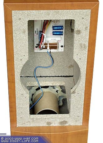 При вскрытии колонки обнаружилось, что пластиковая накладка на передней панели, к которой крепится динамик, является лишь декоративной, поскольку непосредственно за ней расположена почти схожая по форме жёсткая стенка корпуса. Пластиковая накладка крепится восемью саморезами. Между панелью и накладкой проложена виброизоляционная прокладка из пористой синтетической резины.