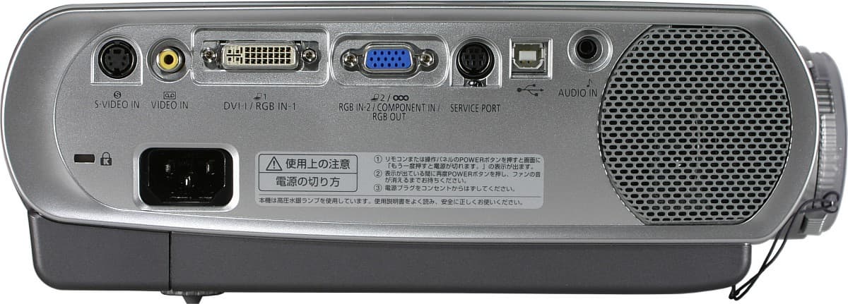 Там же, под обманчиво большой решеткой помещен крохотный динамик. Разъемы расположены достаточно свободно, в один ряд, ближе к верху, в результате пользователь не испытывает никаких затруднений при подключении проектора к источнику сигнала. В левую боковую панель вделана большая решетка, через которую проектор отводит отработанный горячий воздух (забирает холодный снизу, из-под днища). Контрольная панель представляет собой несколько серебристых кнопок в темно-синей вставке.