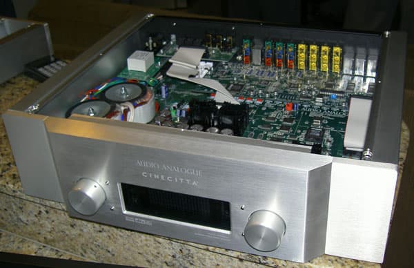 В аудио части применен 24-битный DSP Cirrus Logic CS493264 предыдущего поколения, который даже в бюджетных ресиверах Pioneer был заменен на Motorola DSP56367, работающий в 48-битном double precision режиме. Фактически все фирмы, производящие современные массовые ресиверы, уже перешли на использование DSP с разрешением >=32 бит. Этот факт не говорит о том, что процессорная часть бюджетного ресивера с DSP 48-бит будет звучать лучше, чем Audio Analogue Cinnecitta. Безусловно нет, нужно учитывать множество других факторов, влияющих на качество звучания, как к примеру, качественный тактовый генератор, примененный в процессоре. Минимальный джиттер тактового генератора окажет на качество звучания значительно большее влияние, чем разница в разрядности DSP, но тем не менее 24-битная обработка даже 16-битных сигналов — это компромисс.