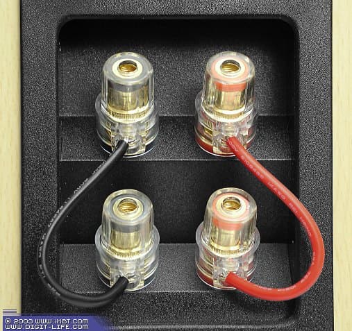 Поскольку Blue 2002 не подвергалась юбилейному тюнингу, то ни кабеля Cordial III, ни модных разъёмов, ни медальки тут нет. Разъёмы — привычные винтовые (с красным и чёрным колпачками).