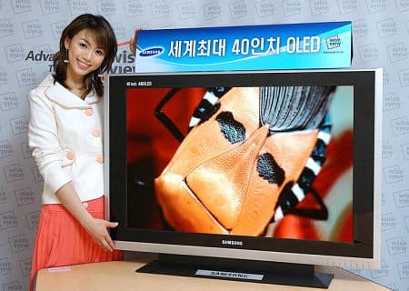Компания Samsung Electronics вновь подтверждает звание лидера на рынке OLED-устройств, продемонстрировав самый большой в мире однопанельный OLED-дисплей с диагональю 40 дюймов. Реальное разрешение активной матрицы (AM) составляет 1280×800 пикселей, основные технические характеристики следующие: яркость 600 nit, контрастность 5000:1, 75-процентный цветовой охват и высокая скорость отклика, что вполне достаточно для просмотра видео высокого качества (HDTV).