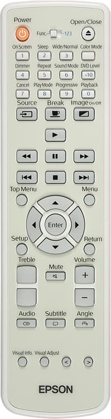 Пульт довольно большой, кнопок на нем много. В передней части пульта расположены мелкие кнопки двойной функциональности: движок перед ними определяет, вызывают они функции или отвечают за ввод цифр. Подписи к этим кнопками слишком мелкие, чтобы уверенно находить нужную кнопку в полутьме. С остальными кнопками дела обстоят несколько лучше — они располагаются свободнее, различаются по форме и размерам и даже (кроме Power и Open/Close) некоторое время, после нахождения на свету, фосфоресцируют синим светом.