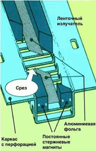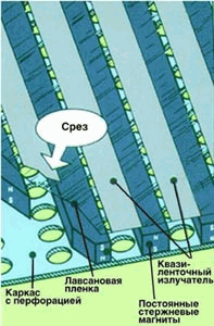 В отличие от квазиленточного ВЧ излучателя, у низкочастотного звуковая катушка в данном случае выполнена с помощью алюминиевого провода, плоские витки которого наклеиваются на лавсановую пленку. Масса при этом больше по сравнению с фольгой, однако, с учетом рабочего диапазона частот, такой излучатель можно считать практически безынерционным.