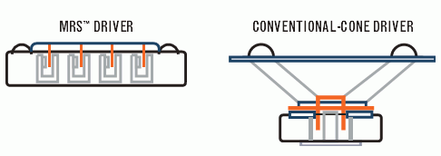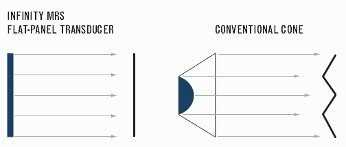Однако подобные схемы, показывающие теоретические преимущества, можно увидеть практически у каждой фирмы, которая на словах докажет, что их динамик непременно лучше всех остальных. Ниже на приведенной диаграмме хотелось бы увидеть сравнение с топовым динамиком от самой Infinity, нежели с безымянным конусным динамиком.