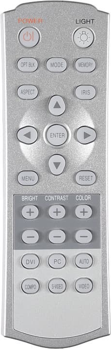 Пульт ДУ небольшой, в руке лежит удобно. Самые нужные кнопки расположены под большим пальцем и легко находятся на ощупь. Найти в темноте домашнего кинозала остальные кнопки поможет подсветка, включающаяся фосфоресцирующей кнопкой LIGHT. Отметим наличие кнопок для выбора источника сигнала (по одной на каждый видеовход) и кнопок +/-, с помощью которых меняется яркость, контрастность и насыщенность (в каком порядке они расположены, придется запомнить, так как подсвечиваются только «плюсы» и «минусы»).