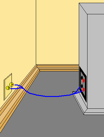 2. Вывод кабеля делается через пол, в результате чего кабеля практически не будет бросаться в глаза, даже если заглянуть за АС. А уж если вывод сделать под колонкой (если АС на шипах, конечно) или близко к ней, то выглядеть всё будет совсем красиво. Плюс: кабеля почти не видно. Минус: дырка в полу смотрится ещё более заметно, чем дырка в плинтусе. Ну а если вы уверены, что двигать колонки никогда уже не будете, то вариант с выводом кабеля из пола — для вас.