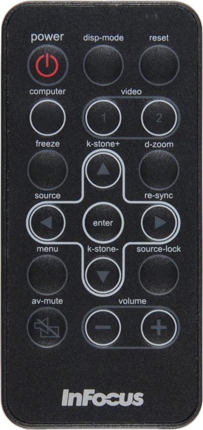 Пульт крохотный с мембранными кнопками. На верхней панели есть специальное гнездо, куда пульт укладывается и откуда не выпадает, благодаря наличию магнитного фиксатора. Гнездо изготовлено из темноокрашенного прозрачного пластика. Находясь в гнезде, пульт по совместительству исполняет роль контрольной панели, при этом единственный ИК-приемник проектора находится в непосредственной близости от ИК-излучателя пульта. На самом проекторе есть только кнопка питания, поэтому потеря пульта или севшая его батарейка доставят владельцу проектора значительные неудобства.