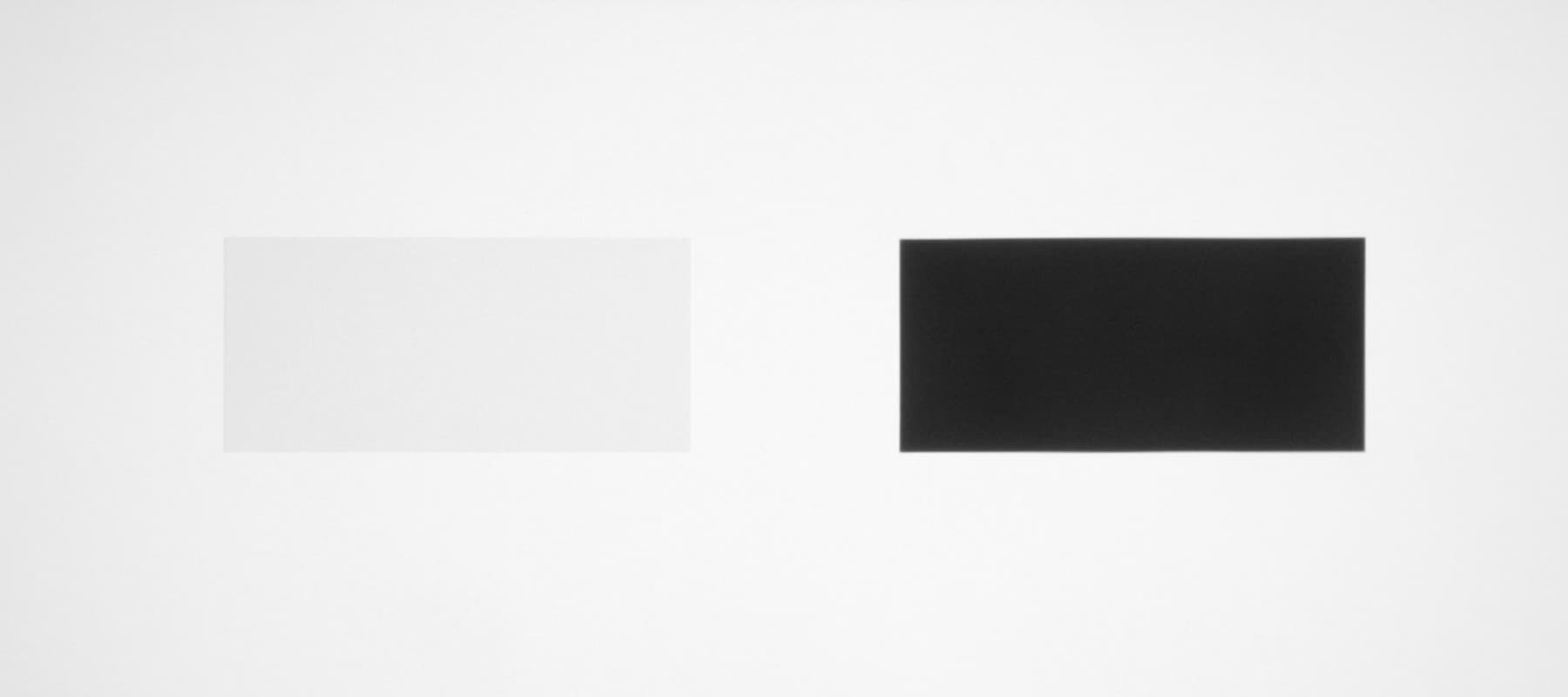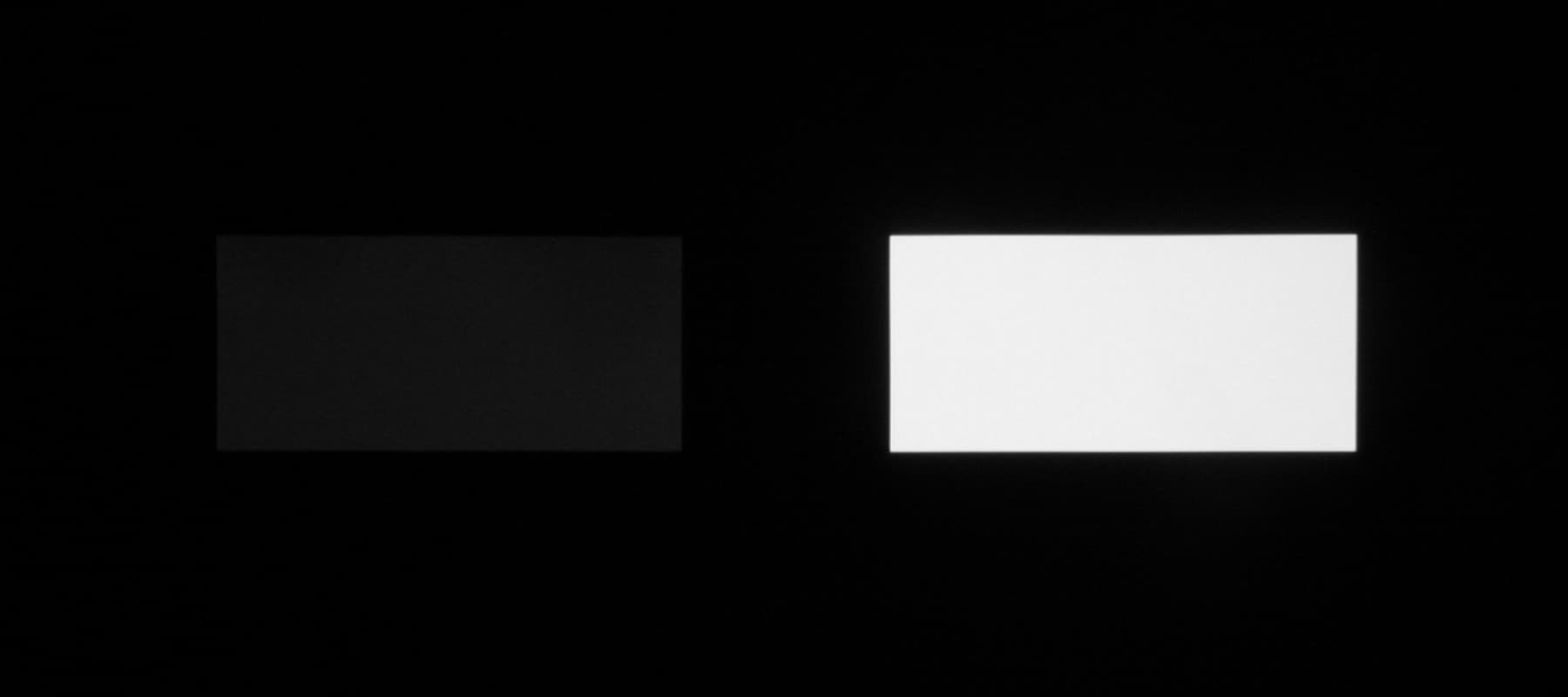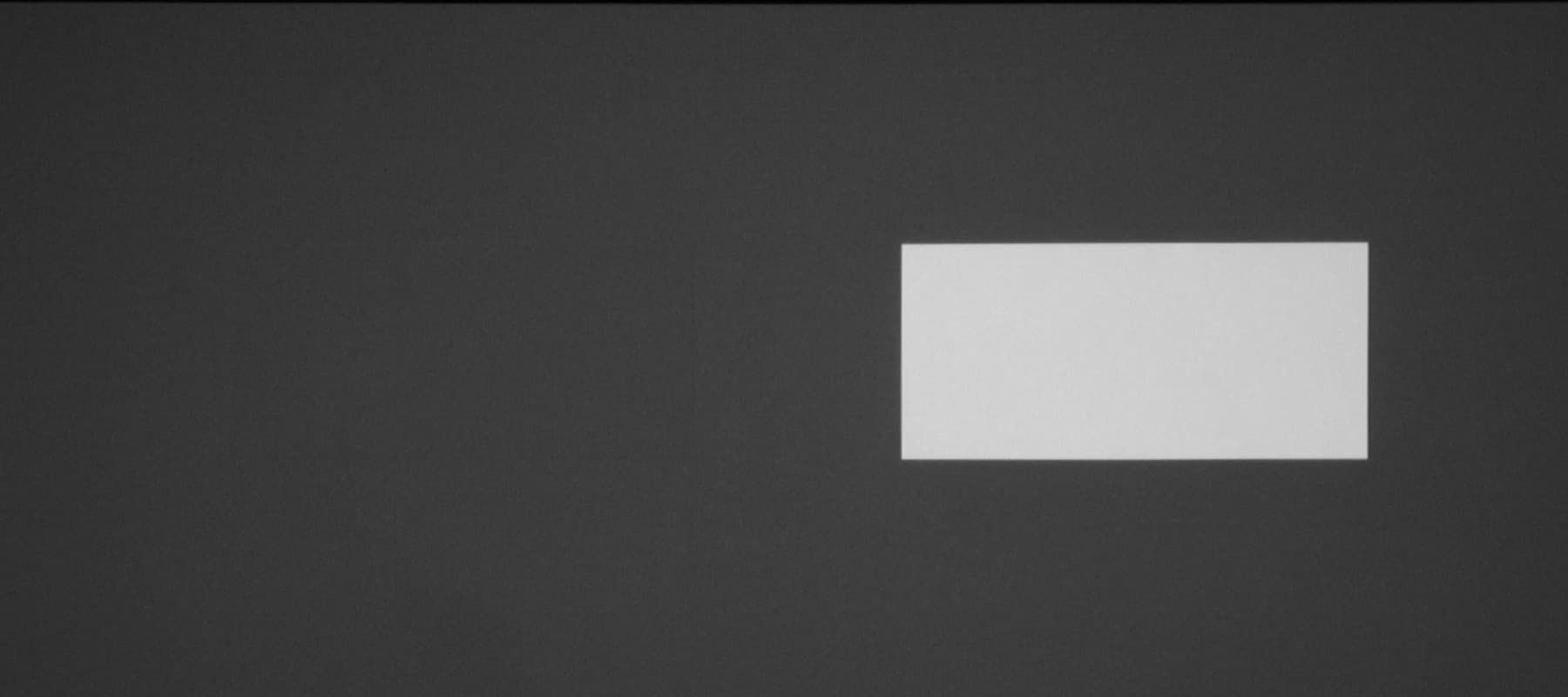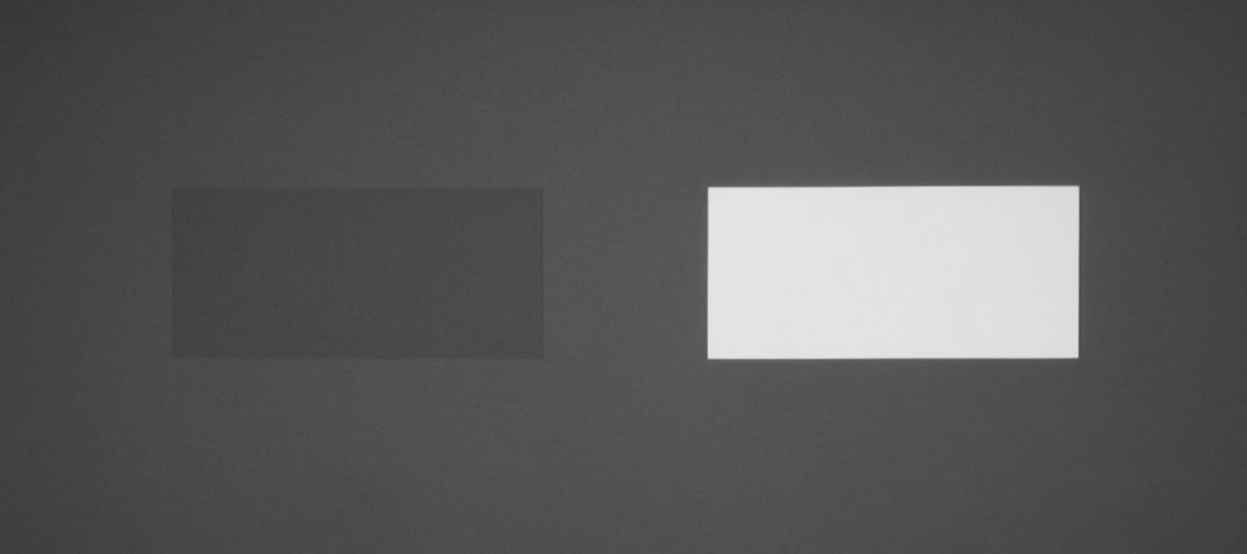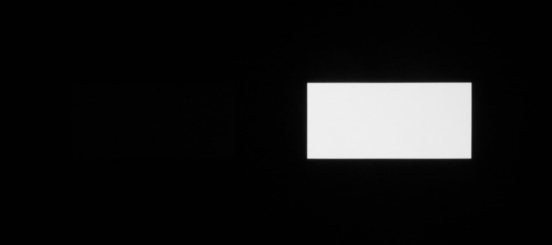Для тестирования эффективности разделения ракурсов для глаз мы вывели три тестовых изображения с черным прямоугольником на белом фоне, с белым прямоугольником на черном фоне и со светло серым прямоугольником на темно-сером фоне. В стереопарах прямоугольники были смещены относительно друг друга, поэтому при просмотре через очки при 100%-ном разделении можно было бы видеть только один прямоугольник. Фотографии ниже сделаны через очки, при этом экспозиция подбиралась так, чтобы белое поле на фотографиях было максимально ярким, но еще не пересвеченным. Тестовое изображение выводилось с частотой 60 кадр/с (для одного глаза).