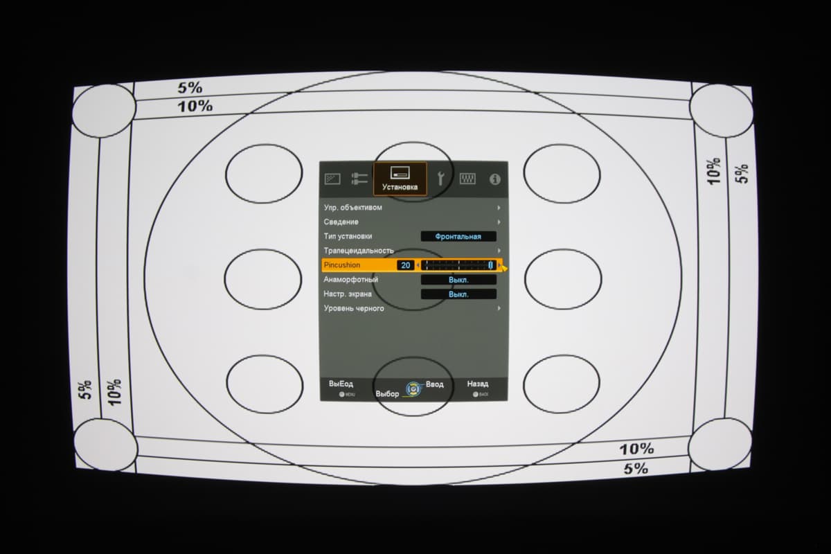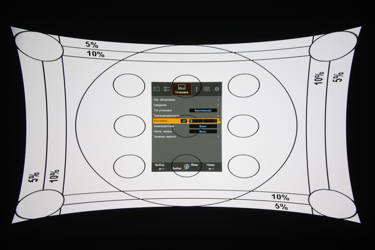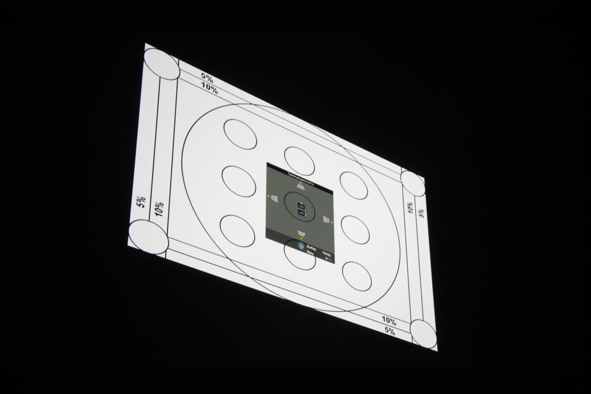 Приводы объектива — фокусировка, трансфокатор и сдвиг — оснащены электрическими механизмами. Сдвигать объектив можно так, что картинка смещается максимум на 80% от высоты проекции вверх и вниз по вертикали и на 34% от ширины проекции вправо и влево по горизонтали относительно центрального положения. При сдвиге по горизонтали уменьшается диапазон сдвига по вертикали и наоборот. Для облегчения настройки проекции на экран автоматически выводится тестовый шаблон (его можно отключить). Чтобы случайно не изменить настройки объектива, можно включить блокировку изменения фокуса, зума и сдвига.