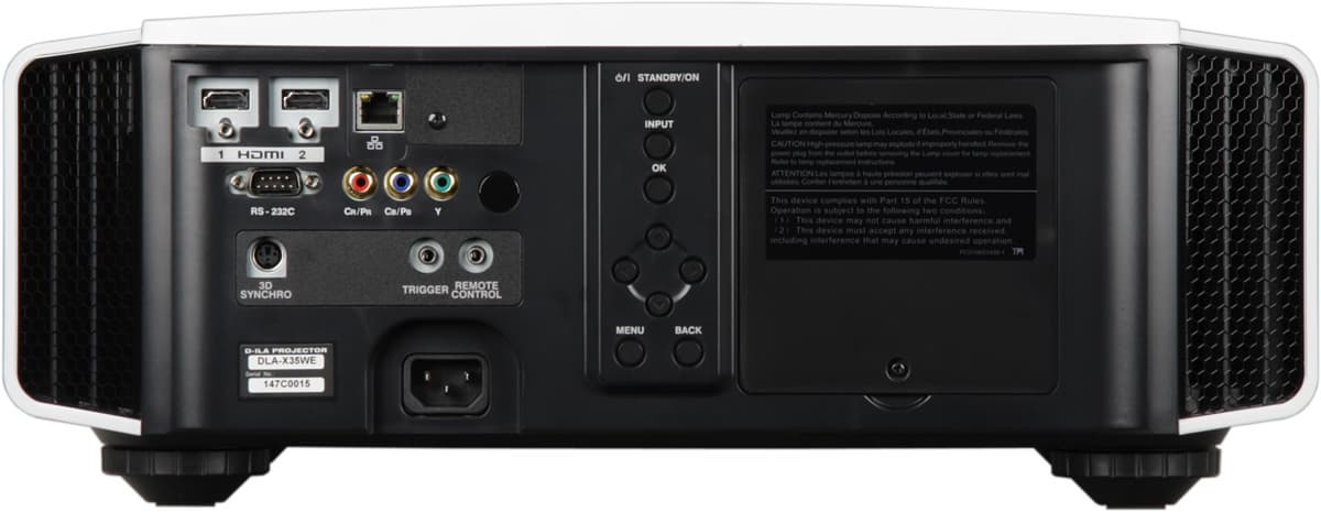 Материал корпуса — это пластик с белым матовым покрытием, за исключение днища и задней панели, которые черные, тоже матовые, но без покрытия. Нам на тестирование достался именно белый вариант DLA-X35 (с буквой W в полном обозначении модели). Конечно, в правильно подготовленном для просмотра кино помещении все поверхности, кроме рабочей части экрана, должны быть черными или очень темными. Для такого помещения, разумеется, нужно приобретать черный вариант проектора. Однако иногда по причине требований дизайна (вернее из-за тех, кто эти требования выдвигает) потолок (или все помещение) делают светлым. В этом неоптимальном для кино случае уместнее установить белый вариант проектора. Кольцо вокруг ниши объектива изготовлено из алюминия.
