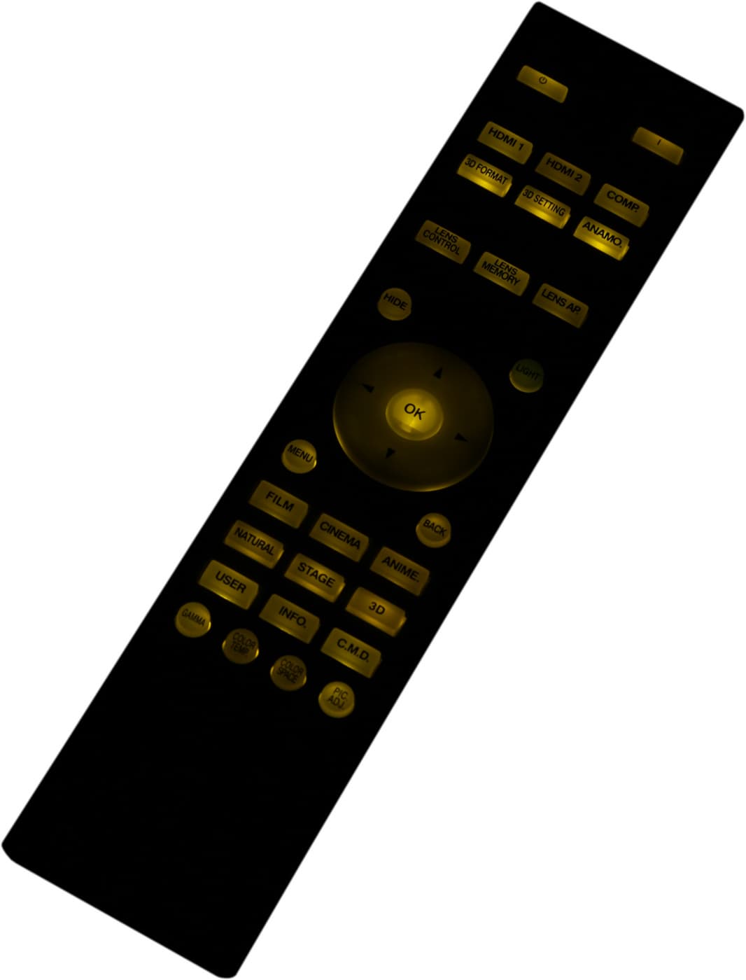 Включение и выключение проектора разнесены на две разные кнопки, подтверждение на выключение запрашивается. В меню можно выбрать код пульта A или B, которым проектор будет управляться. На самом пульте код меняется описанной в руководстве комбинацией кнопок. Заявлено, что как пульт ДУ можно использовать смартфоны и телефоны, установив на них соответствующее приложение. Разумеется, для реализации этой функции проектор и устройство должны быть подключены к сети передачи данных.