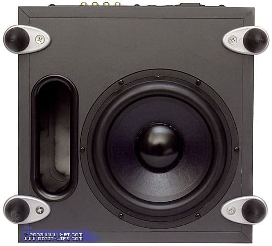 Динамик и порт фазоинвертора располагаются на нижней панели. Такая компоновка, как правило, позволяет получить более равномерное распространение баса по комнате, потому что пол в данном случае выступает в роли «акустического зеркала». Но это всё в теории. На деле же всё зависит от каждой конкретной комнаты (материал стен, площадь, геометрия, отделка, обстановка), места нахождения сабвуфера в ней и места расположения слушателя. Эти факты оказывают колоссальное влияние на конечный звук сабвуфера в комнате.