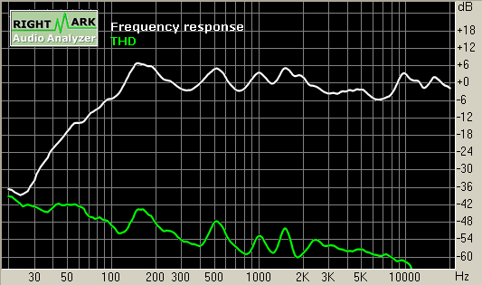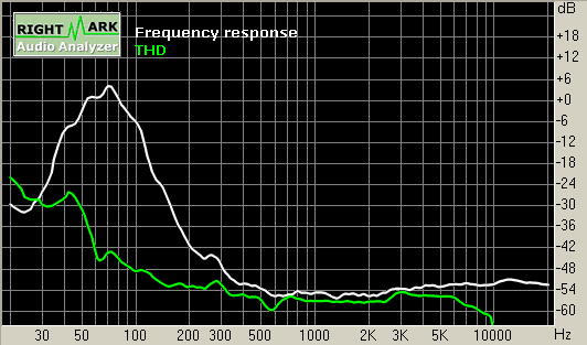 Порт фазоинвертора настроен на довольно высокую частоту резонанса: внушительный «горб» АЧХ в районе 160 Гц появился не без его помощи. Вообще, АЧХ довольно неравномерна, а вот уровень искажений действительно низкий.